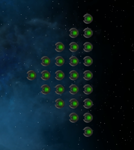 This wave spawns lines of objects, but parents them to a central empty GameObject which is given a rotation value that you set. This causes the entire line of objects that get spawned to rotate in tandem. You can create star-like patterns by spawning multiple copies of this type of wave on top of each other (using a 0 delay), and by setting each wave to have a different rotational value.